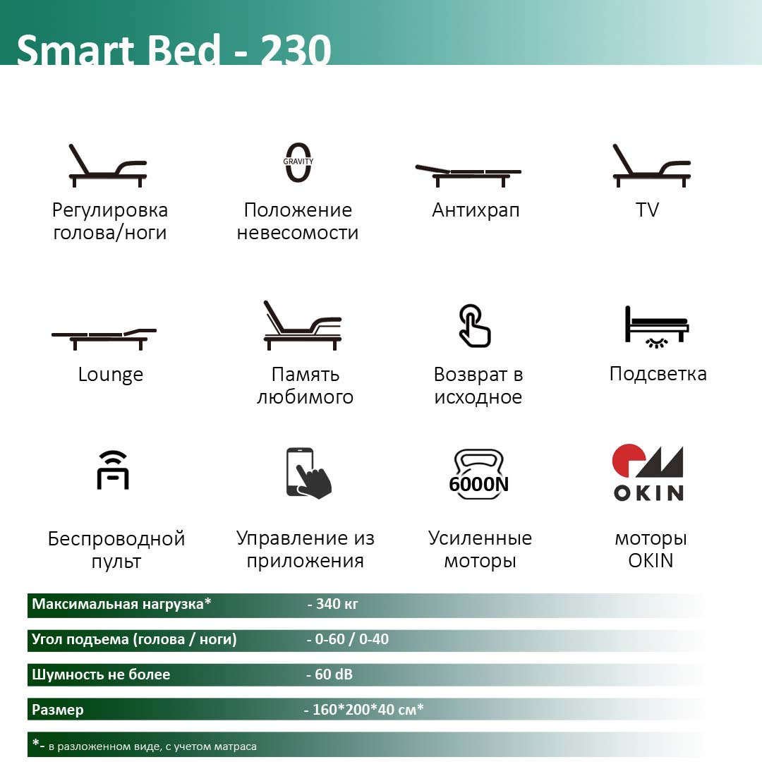✔️ Функция «Антихрап» приподнимает верх корпуса для удобного дыхания, режим «Невесомость» способствует расслаблению и улучшению циркуляции крови.