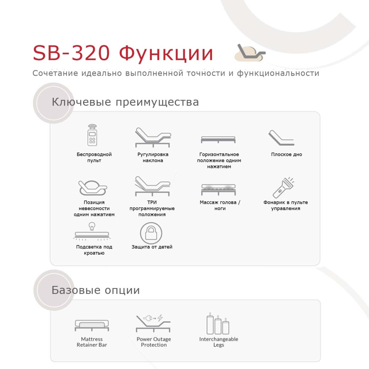 Трансформируемое основание Smart Bed-320 (180×200) - удобное и функциональное решение для сна и отдыха, сочетает надёжность классической кровати с преимуществами регулируемого положения. Модель позволяет плавно менять конфигурацию спинки и ножной секции, создавая оптимальные условия для расслабления, чтения или просмотра телевизора.